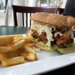 Homemade buttermilk fried chicken tenders stacked on a brioche bun, topped with Buffalo sauce, sriracha aioli, lettuce & slaw. Served with choice of fresh cut fries or garden salad.