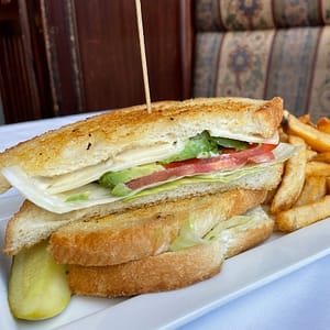 Butter toasted sourdough bread layered with roasted garlic aioli, avocados, tomatoes, iceberg lettuce & Swiss cheese.