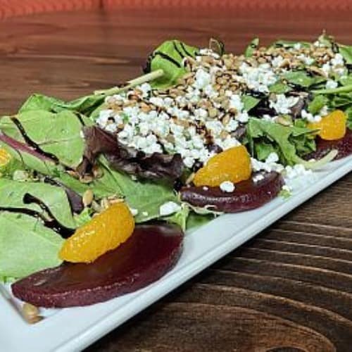 Baby greens dressed with red beets, mandarin oranges, goat cheese, sunflower seeds and a balsamic glaze.
