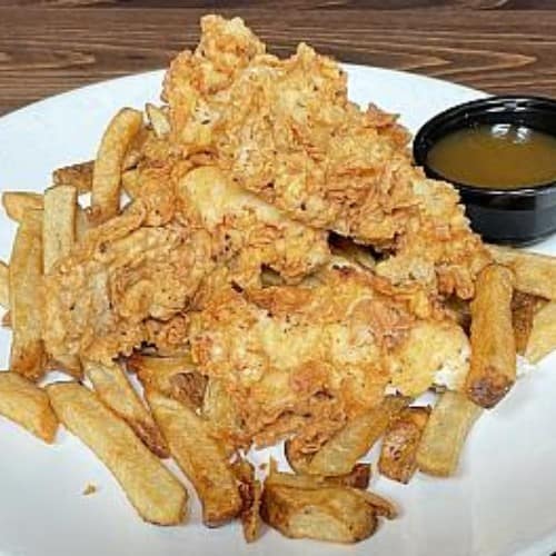 Juicy chicken tenders are double breaded in house and fried to perfection. Served with fresh cut fries and plum sauce.