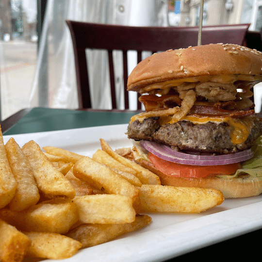 Our house made chuck burger melted with Cheddar cheese, and topped with smoky bacon, crispy onion straws & Sriracha aioli. Served with choice of fresh cut fries or garden salad.