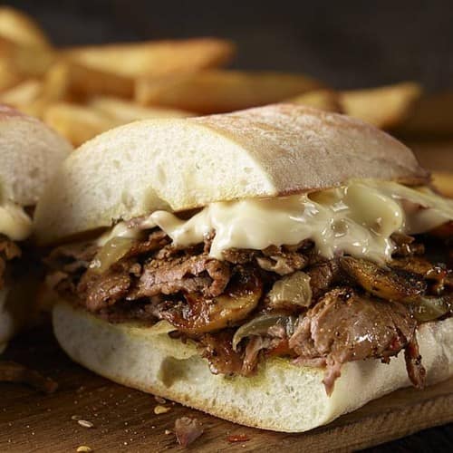 Shaved prime rib, cremini mushrooms, red onions, Swiss cheese and roasted garlic aioli on a toasted panini bun. Served with choice of fresh cut fries or garden salad.