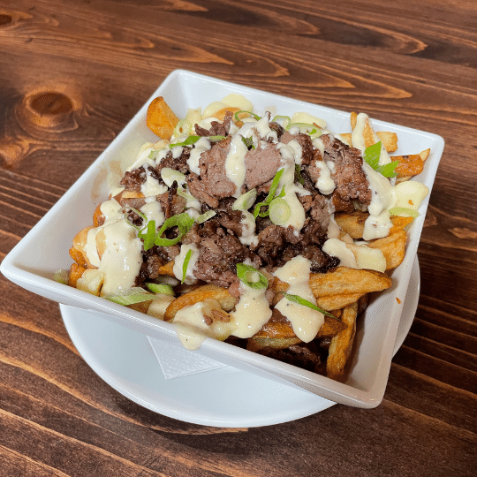 Our famous fries topped with Quebec cheese curds, gravy and scallions, finished with a drizzle of horseradish aioli.