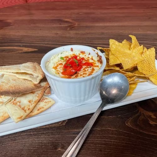 A blend of baby spinach with roasted red peppers and cream cheese, baked with Cheddar & Mozzarella cheeses. Served with naan points and corn chips.